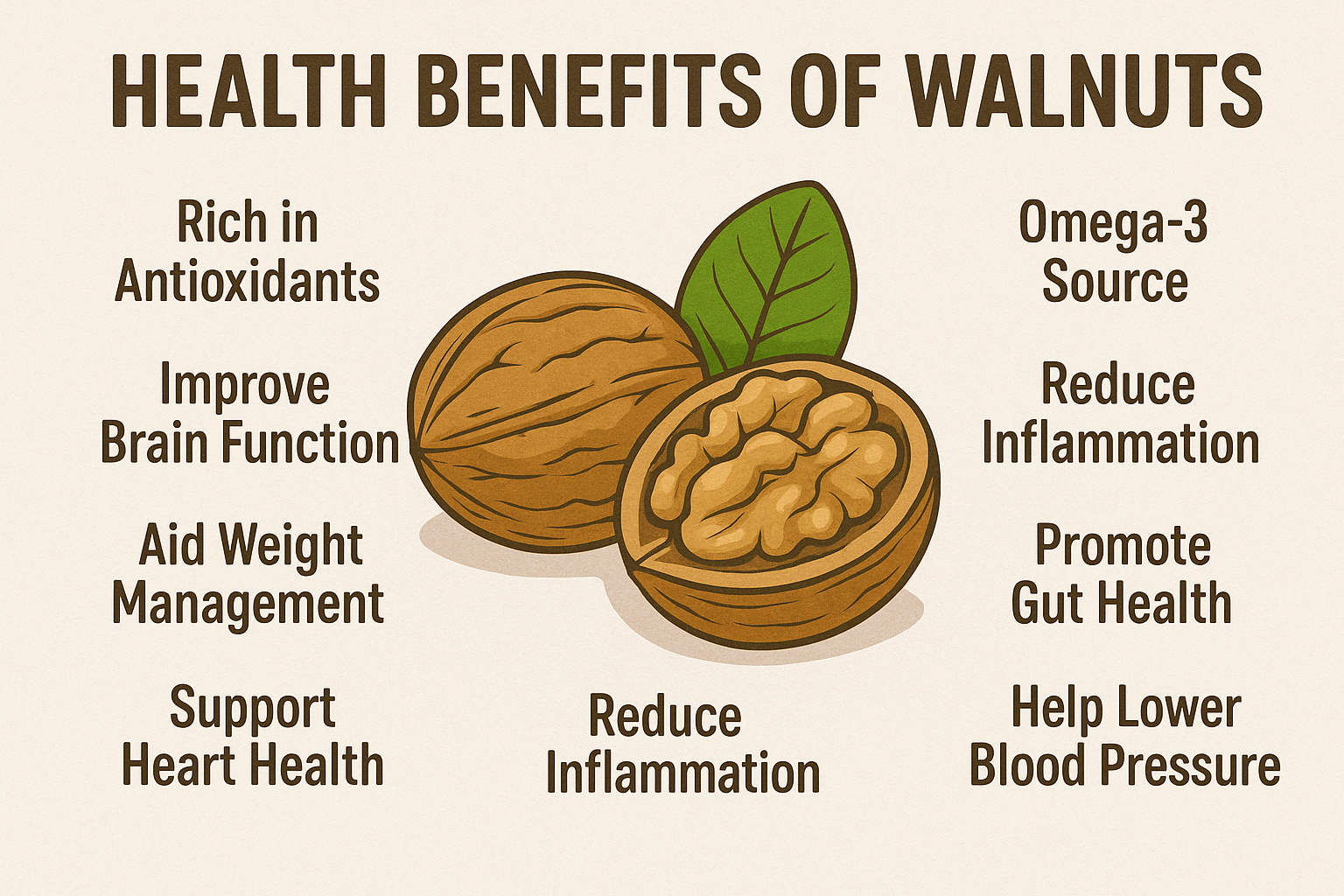 - Health Benefits: Consuming walnuts regularly has been associated with numerous health benefits, including reducing the risk of heart disease, improving brain function, supporting weight management, and reducing inflammation. The omega-3 fatty acids found in walnuts are particularly beneficial for heart health and may help lower cholesterol levels and blood pressure.